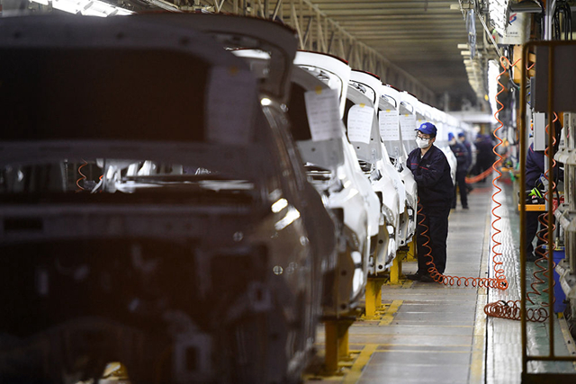 ↑2月18日,長安汽車渝北工廠的工人在生產(chǎn)線上忙碌。新華社記者 唐奕 攝