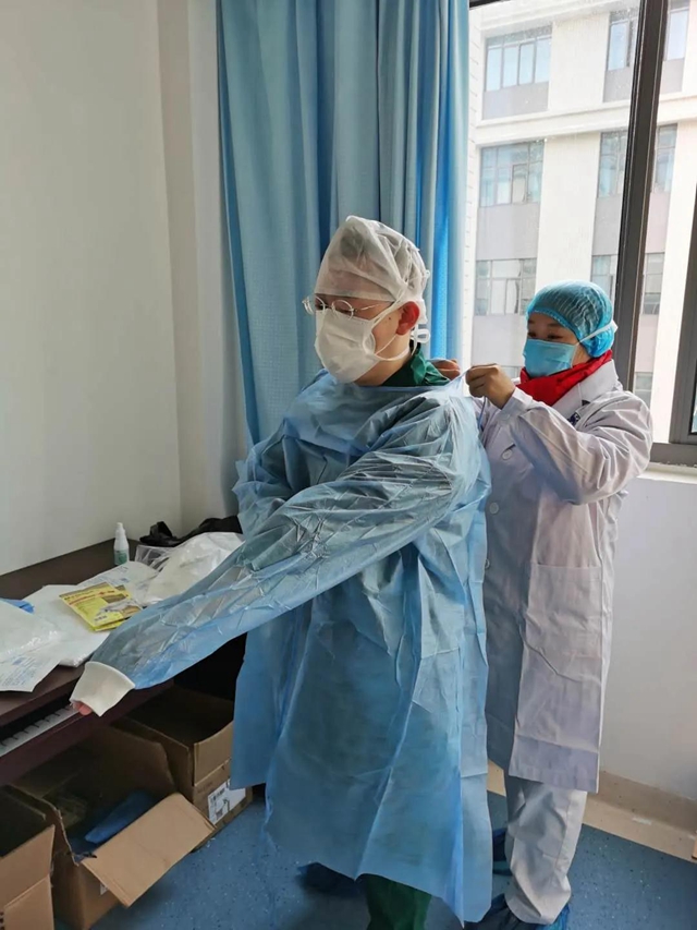 2月27日,是錢奎到孝感市第一人民醫(yī)院隔離病區(qū)工作的第一天,從醫(yī)院大門、清潔區(qū)、污染區(qū)……眼看著離“敵人”越來越近,錢奎沒有絲毫退縮,反而告誡自己,從小戰(zhàn)場到大戰(zhàn)場,細(xì)心細(xì)致地做好防護(hù),只有保護(hù)好自己,才能救治更多的患者。當(dāng)錢奎穿戴好所有的防護(hù)裝備后,他打開隔離污染區(qū)大門勇敢前進(jìn),心里默念著:“疫情,我來了。”