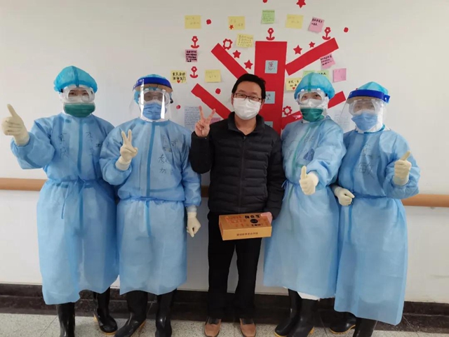 云陽醫(yī)療隊(duì)員與接手病房后出院的第一名患者合影