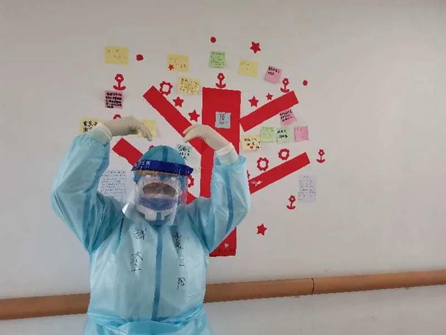 錢奎在愿望樹下比心,為醫(yī)務(wù)人員和患者加油
