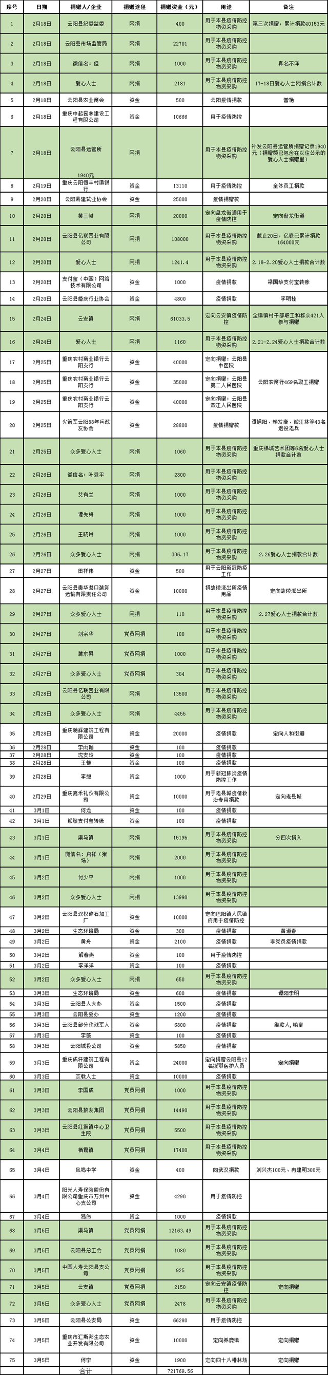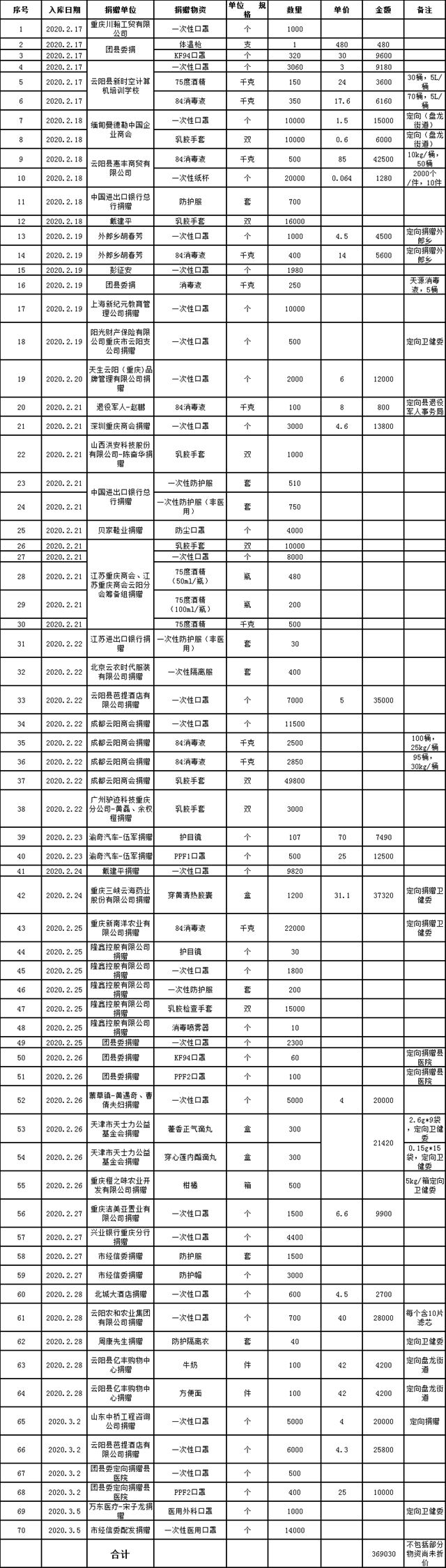 自2020年1月新型冠狀肺炎疫情爆發(fā)以來,自2月17日16時(shí)到3月5日16時(shí),云陽(yáng)縣慈善會(huì)共匯總接受各方面援助我縣抗擊新冠肺炎疫情的物資和資金1090799.56元,其中物資369030元(不包括部分物資尚未折價(jià))?,F(xiàn)公示如下: