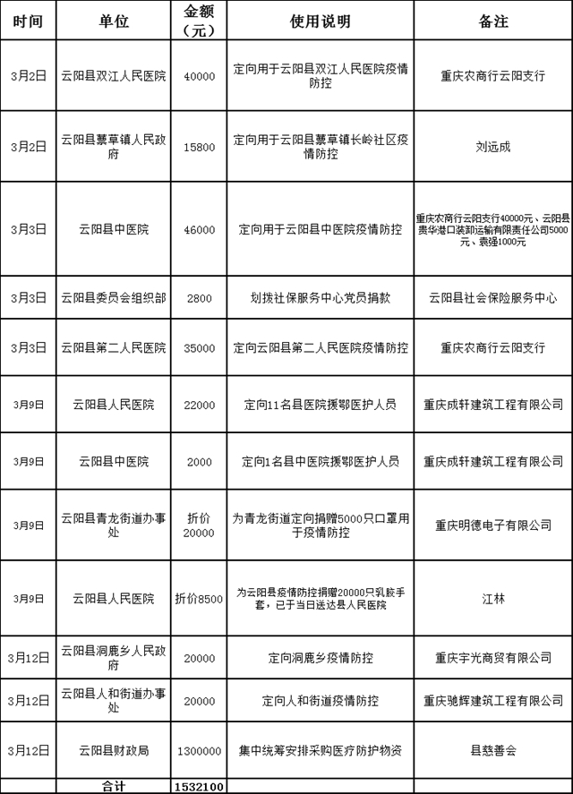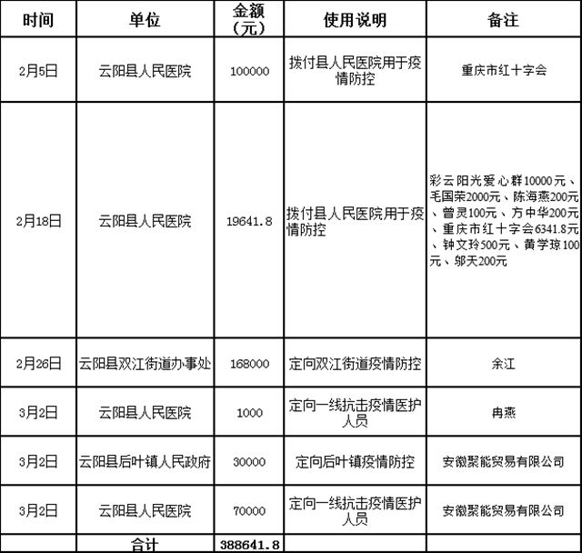 自2月19日15點(diǎn)至3月12日15點(diǎn),云陽縣慈善會(huì)共匯總接受各方面援助我縣抗擊新冠肺炎疫情的資金2381234.66元,物資折幣4581908.00元(不包括尚未折價(jià)的物資)。