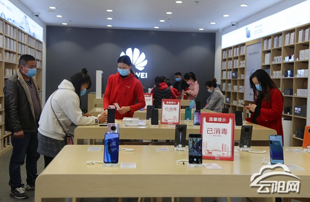 記者來到云江大道華為專賣店門口,看到不少戴著口罩的消費(fèi)者正在選購手機(jī)?!霸缇拖霌Q手機(jī)了,前段時間天天在家里上網(wǎng)看款式、選型號,就想快點(diǎn)到實體店看看真機(jī)。一個多月沒出門了,今天一出門就來專賣店看手機(jī),合適的話就準(zhǔn)備買了。”市民李蘭紅邊拿著店里的樣板機(jī)研究,邊跟記者說。