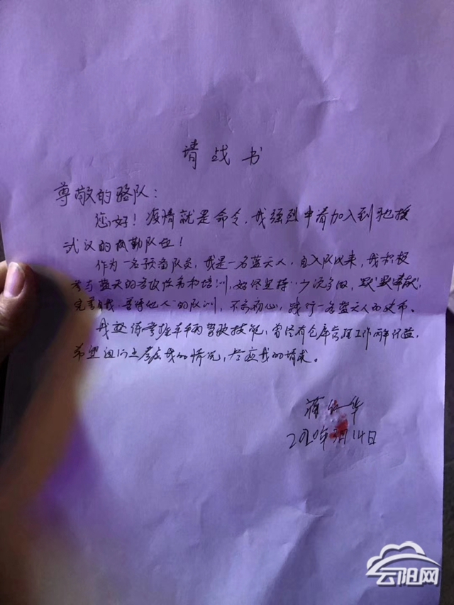 賀皓亮和蔣仁華在疫情防控期間多次參與萬(wàn)州、云陽(yáng)等地公共區(qū)域消殺任務(wù),有豐富的作業(yè)經(jīng)驗(yàn)。為了能夠?yàn)橐咔榉揽刎暙I(xiàn)力量,兩人寫下請(qǐng)戰(zhàn)書(shū),申請(qǐng)馳援武漢。這也是繼2月25日云陽(yáng)首支醫(yī)療隊(duì)出征支援湖北后,又一批來(lái)自云陽(yáng)的救援力量奔赴前線。