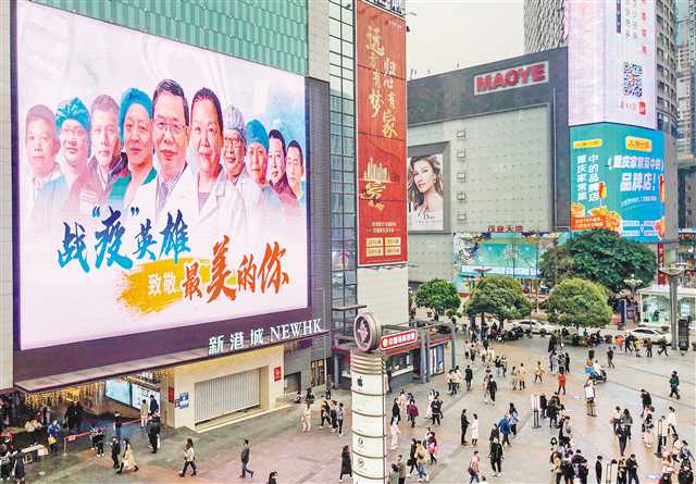 3月15日,江北區(qū)觀音橋商圈,LED屏幕正播放戰(zhàn)“疫”英雄形象短片。記者 萬(wàn)難 攝