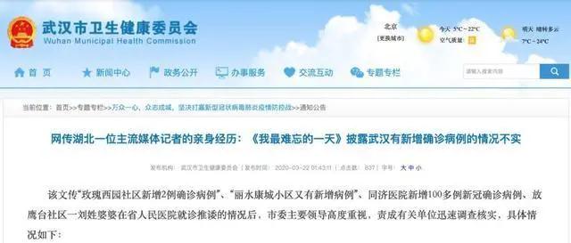 3月22日凌晨,武漢市疫情防控指揮部涉疫大數(shù)據(jù)與流行病學調(diào)查組通報:《我最難忘的一天》披露武漢有新增確診病例的情況不實。該文曾以“湖北一位主流媒體記者”的名義,稱武漢有新增確診病例。