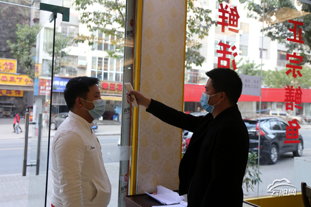 3月23日,記者來(lái)到鳳鳴鎮(zhèn)場(chǎng)鎮(zhèn)。在一家餐飲店門前,工作人員正為前來(lái)吃飯的顧客測(cè)量體溫,并提示顧客洗手、消毒。
