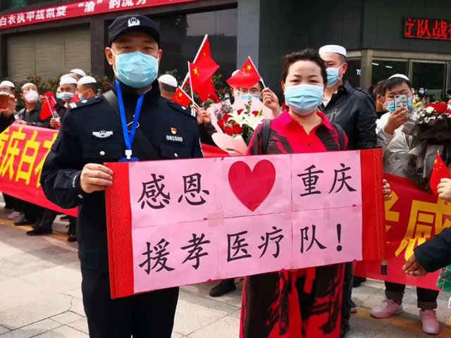 在歡送現(xiàn)場,志愿者們?yōu)獒t(yī)療隊員搬運行李,市民們高舉著“告別重慶白衣天使們,謝謝你們!孝感的青海拉面永遠為你免費”等橫幅,在場的各界群眾一直高喊著“辛苦了!感謝你們,白衣天使”。