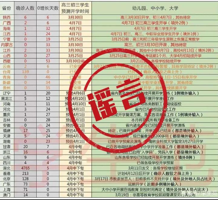 近日,一張網(wǎng)絡(luò)截圖在重慶部分微信群流傳,截圖內(nèi)容中包含了全國各地的開學(xué)預(yù)測時間。其中,重慶高三和初三年紀(jì)的開學(xué)預(yù)估時間為4月1日。