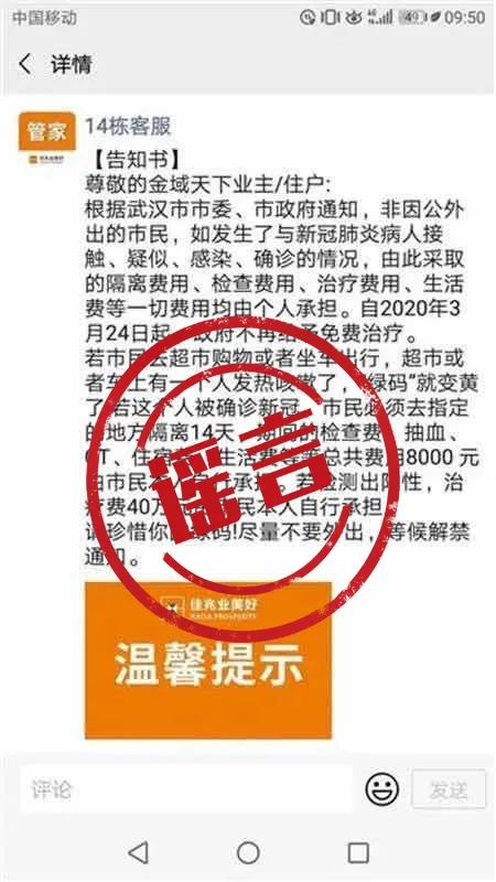 3月25日,網(wǎng)上流傳多個武漢小區(qū)給業(yè)主(住戶)的《告知書》,稱自2020年3月24日起武漢市政府不再對新冠肺炎病人免費治療。