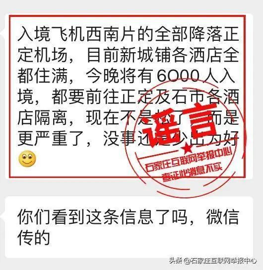 石家莊互聯(lián)網(wǎng)舉報中心:在外防輸入的疫情防控關(guān)鍵時期,對于入境防疫工作相關(guān)信息,請以官方權(quán)威發(fā)布信息為準(zhǔn),勿傳謠信謠、引發(fā)恐慌!
