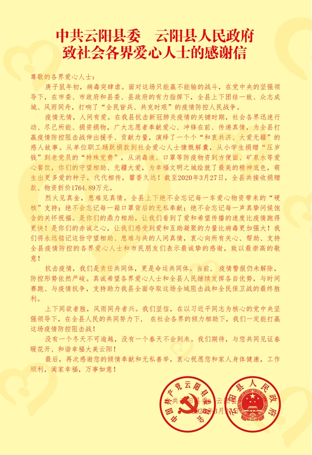 烈火見真金,患難見真情。全縣上下絕不會(huì)忘記每一車愛心物資帶來的“硬核”支持;絕不會(huì)忘記每一箱口罩背后的無私奉獻(xiàn);絕不會(huì)忘記每一聲真摯問候飽含的關(guān)懷祝福。是你們的鼎力相助,讓我們看到了愛和希望傳播的速度比疫情跑得更快!是你們的赤誠(chéng)之心,讓我們感受到愛和互助凝聚的力量比病毒更加強(qiáng)大!我們將永遠(yuǎn)銘記這份守望相助、患難與共的人間真情,衷心向所有關(guān)心、幫助、支持全縣疫情防控的各界愛心人士和市民朋友們表示最誠(chéng)摯的感謝,致以最崇高的敬意!