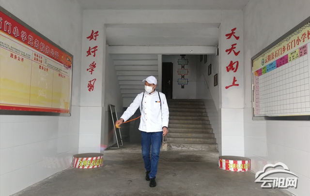 莫道君行早,更有早行人。在石門小學(xué)教學(xué)樓廊道,只見一位工人戴著口罩,身著工作服,背著噴霧器正在消毒。該校所在的石門地處云陽縣“東大門”,與奉節(jié)縣紅土鄉(xiāng)毗鄰,距離新縣城79公里,全校共有9個(gè)班級,24名在崗教師,186名學(xué)生,典型的山區(qū)“袖珍學(xué)?!薄?/p>