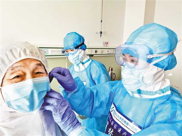 3月18日,重慶醫(yī)療隊(duì)醫(yī)生正在為即將出院的患者換上隔離服。