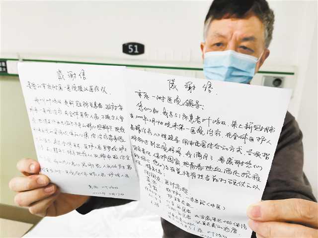3月17日,武漢市第一醫(yī)院,一名即將出院的患者展示他寫給重慶醫(yī)療隊(duì)的感謝信。