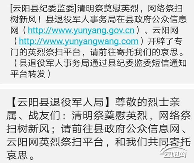活動中,縣退役軍人事務(wù)局借助新媒體發(fā)布“致敬·2020清明祭英烈”網(wǎng)上祭掃活動倡議書,在縣人民政府公眾信息網(wǎng)、云陽網(wǎng)開設(shè)英烈祭掃平臺,并通過短信群發(fā)的方式向全縣烈士親屬、退役軍人、軍屬推送網(wǎng)上祭掃短信3萬余條,主動對接縣紀(jì)委監(jiān)委平臺向全縣干部職工同步進(jìn)行推送4萬余條,共同引導(dǎo)大家樹網(wǎng)絡(luò)祭掃新風(fēng)。