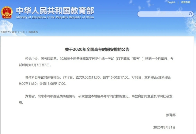 1.【云陽家長(zhǎng)注意:今年高考延期一個(gè)月】3月31日,教育部發(fā)布《關(guān)于2020年全國(guó)高考時(shí)間安排的公告》。2020年全國(guó)普通高等學(xué)校招生統(tǒng)一考試延期一個(gè)月舉行,考試時(shí)間為7月7日至8日。(向心理引導(dǎo),加油鼓勁方向說)(來源:愛云陽)