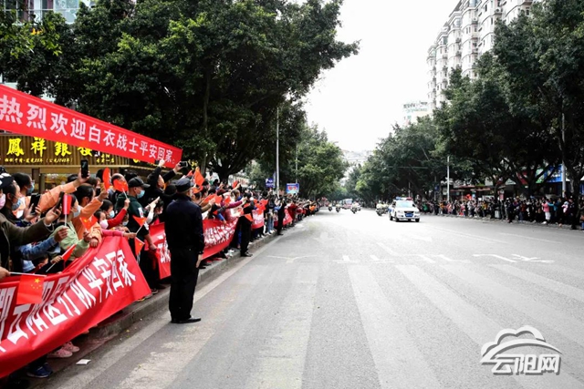 “熱烈歡迎云陽援湖北醫(yī)療隊凱旋!”“致敬白衣天使,致敬最美逆行者!”“最美白衣天使,云陽人民的驕傲!”返城路上,市民自發(fā)守候在道路兩旁,一邊向英雄揮手致敬、鼓掌,一邊高喊著“歡迎回家”的口號,表達對英雄的尊敬與感謝。