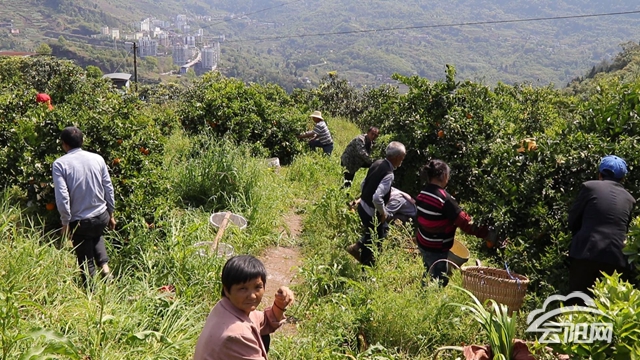 果林里,村民們挑著竹筐,正忙著摘果子;公路邊,收購的大車正裝車準備啟程發(fā)貨。