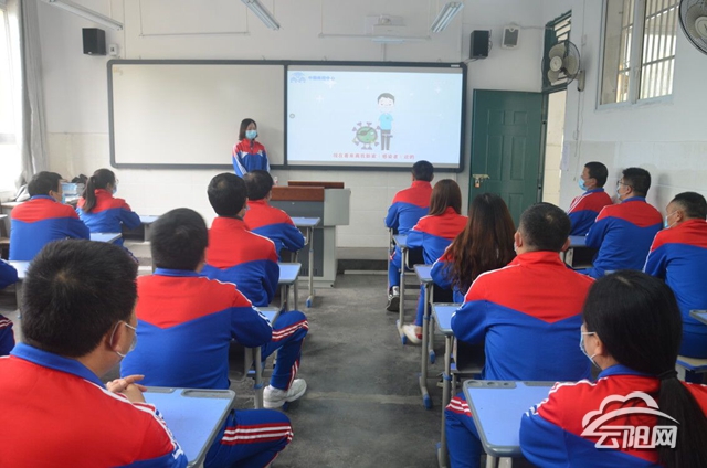 在五(1)班的教室里,班主任正在組織學(xué)生觀看“科學(xué)防疫”視頻,突然一位學(xué)生舉手報(bào)告身體不適,并伴有發(fā)燒、咳嗽癥狀,班主任立即上報(bào)校防疫辦,帶離該生至校隔離室觀察,并通知家長,防控人員立刻到班級組織其他學(xué)生開展防疫隔離相關(guān)工作。