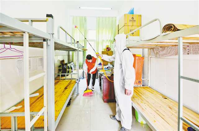 四月十六日,渝北區(qū)大灣鎮(zhèn)高嘴學(xué)校,志愿者在宿舍做清潔消毒。記者 齊嵐森 攝