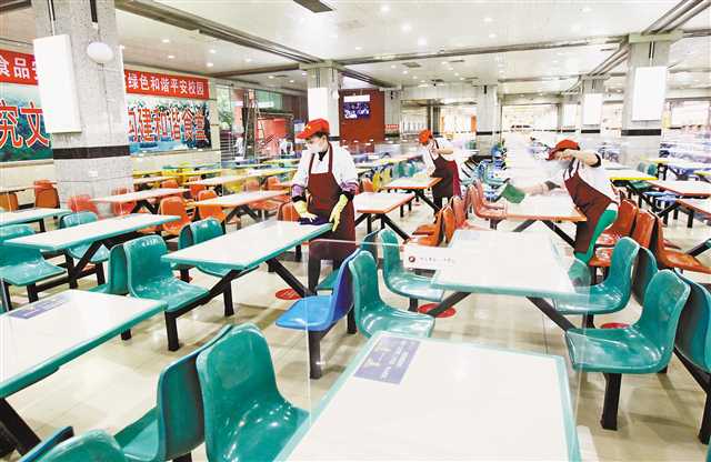 四月十八日,重慶一中,食堂餐桌加裝了隔離板,工作人員正在做清潔衛(wèi)生。記者 盧越 攝