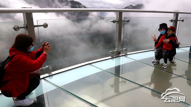 “似漫步云端天際之間,步步驚心!霧中賞景,更是妙如仙境?!眮?lái)到龍缸景區(qū)的云端廊橋,早上的濃霧還未散去,大家更是興奮不已,紛紛踏上橋面感受龍缸的險(xiǎn)峻。膽大的還坐上了懸崖秋千,在空中欣賞山林幽秀景色,驚險(xiǎn)又刺激。