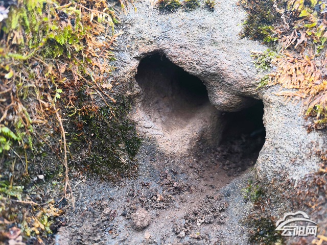 這是一塊約有50多立方米的砂石,從遠(yuǎn)處看外觀像一只牛角,石頭上有數(shù)個直徑約七八公分大小的孔眼,前后孔眼相連相通,邊緣有明顯的劈痕。