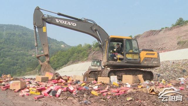 當天,在相關單位工作人員進行了物資清點核對后,裝滿各類假冒偽劣商品的車輛從城區(qū)出發(fā),統(tǒng)一運輸至位于人和街道的云陽垃圾處理場。在大型挖掘機的轟鳴聲中,各類假冒偽劣商品被重砸、碾壓銷毀,然后倒進垃圾池進行無害化處理。據(jù)了解,此次銷毀物資涉及食品、藥械、農資等一大批事關百姓生命健康與合法權益的日常必需品,包括口罩、卷煙、調料、中藥材、種子、藥品等等,貨值合計60萬余元。