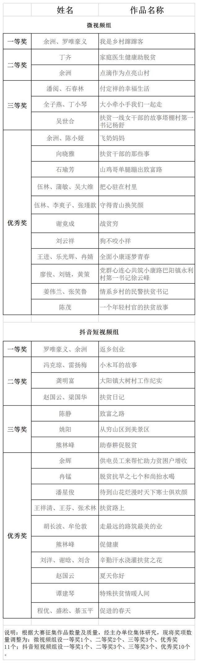說(shuō)明:根據(jù)大賽征集作品數(shù)量及質(zhì)量,經(jīng)主辦單位集體研究,現(xiàn)將獎(jiǎng)項(xiàng)數(shù)量調(diào)整為:微視頻組設(shè)一等獎(jiǎng)1個(gè)、二等獎(jiǎng)2個(gè)、三等獎(jiǎng)3個(gè)、優(yōu)秀獎(jiǎng)11個(gè);抖音短視頻組設(shè)一等獎(jiǎng)1個(gè)、二等獎(jiǎng)3個(gè)、三等獎(jiǎng)3個(gè)、優(yōu)秀獎(jiǎng)10個(gè)。