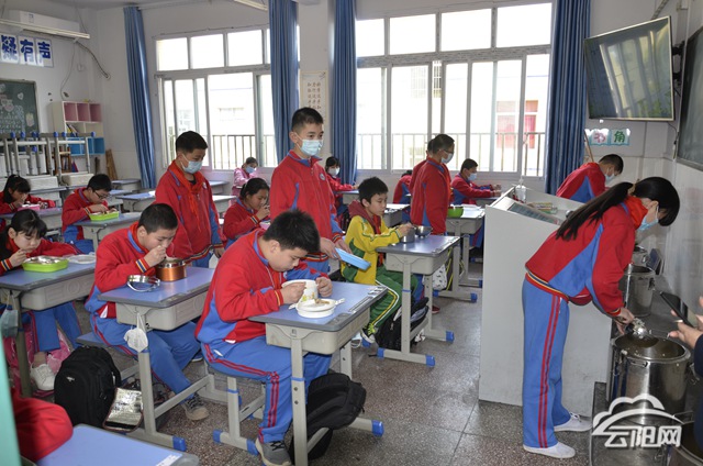 中午用餐是怎樣的呢?旁邊一位六年級的同學說:“我們用餐都是每個班上由四位班干部提到教室,其余同學分批次洗手,然后依次排隊分餐在自己的課桌上就餐。”