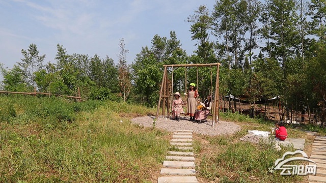 除了主題攝影,游客們還能蕩秋千、玩蹺蹺板,玩累了到農(nóng)莊旁的小森林散步、休憩、采桑葚。