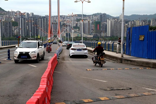 施工期間,長江大橋引橋及主橋單側(cè)人行道封閉,車行道半幅封閉,實行雙向單道管制通行,全橋限速5公里/小時。