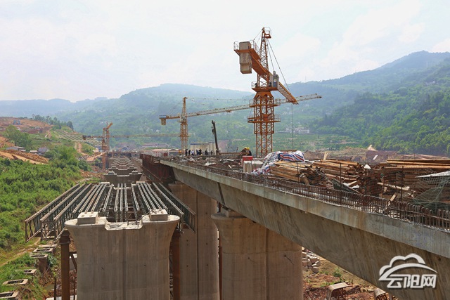 據(jù)了解,澎溪河多線特大橋全長(zhǎng)741.6米,共14跨,其中主跨長(zhǎng)度為200米,主墩在長(zhǎng)江一級(jí)支流澎溪河中,大橋的一頭連接人和隧道,另一頭連接云陽車站多線特大橋,是萬州方向到云陽站的最后一公里路程。