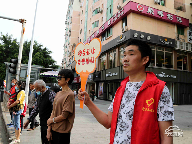 云陽(yáng)網(wǎng)訊(記者 鄧?yán)冢罢?qǐng)往馬路內(nèi)側(cè)站,不要離馬路太近……”5月16日,在云江大道愛家路口,志愿者穿著紅背心,手拿標(biāo)識(shí)牌,勸導(dǎo)市民安全、文明有序過(guò)馬路。