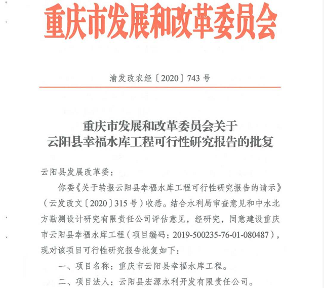 批復同意建設重慶市云陽幸福水庫工程