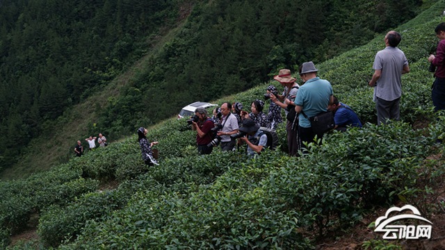 當(dāng)天,文藝家們先后走進龍缸茶業(yè)基地的古鹽道、歧陽關(guān)等地尋找歷史的印跡,來到茶園里欣賞茶山的美景,體驗采茶的樂趣。在歧陽茶園,一株株茶樹綿延數(shù)座山頭,郁郁蔥蔥,綠意盎然,堆綠疊翠的層層茶園隱藏在雨霧之中,一個個采茶姑娘穿梭在層層疊疊的茶園之中,悠閑地采茶。攝影家協(xié)會的攝影家們用相機記錄下了一個個精彩的瞬間,作家協(xié)會的用語言表達對自然的贊美。