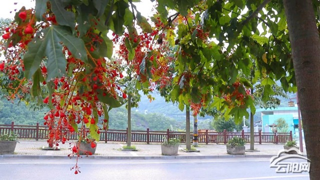 火焰木樹形十分優(yōu)美,花深紅色,量大而艷麗,適合庭院和公園種植,也可作沿路生態(tài)景觀建設(shè)。龍角鎮(zhèn)結(jié)合云利路景觀建設(shè),在場鎮(zhèn)路段栽植有100多棵火焰木,目前開花期還可持續(xù)約一個月。