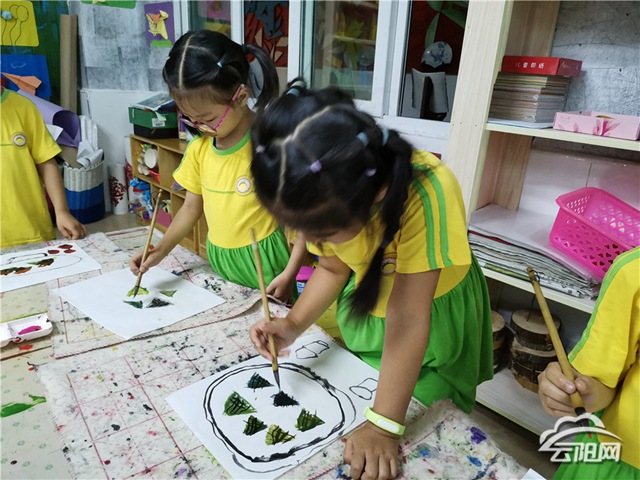 在活動前的親子調(diào)查中,孩子們和爸爸媽媽一起搜集了許多關(guān)于端午節(jié)習俗的圖片和傳說?;顒又?,孩子們知道了屈原的故事,了解了吃粽子、掛艾草、系香包、賽龍舟等端午節(jié)傳統(tǒng)習俗,欣賞了《賦端午》等古詩詞,并嘗試用傳統(tǒng)水墨畫的形式畫粽子。