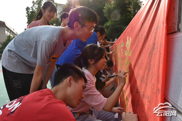 各班考生還到高考勵志宣言巨幅標(biāo)語榜上簽名留念,有的還寫下了班級和個人的個性宣言,為青春和夢想奮斗。