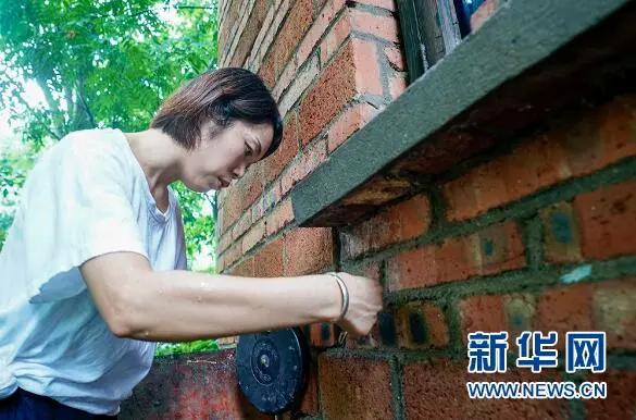 地質(zhì)災(zāi)害監(jiān)測(cè)員侯芳對(duì)一處農(nóng)房的墻上裂縫寬度進(jìn)行測(cè)量。