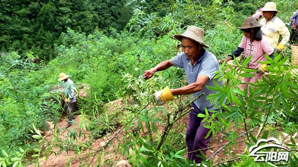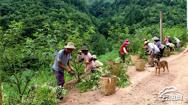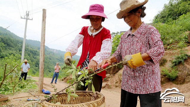 七月,花椒采摘進入尾聲,平安村村民李孟蘭正和大伙兒一起采摘最后一批花椒,并給花椒樹修枝。