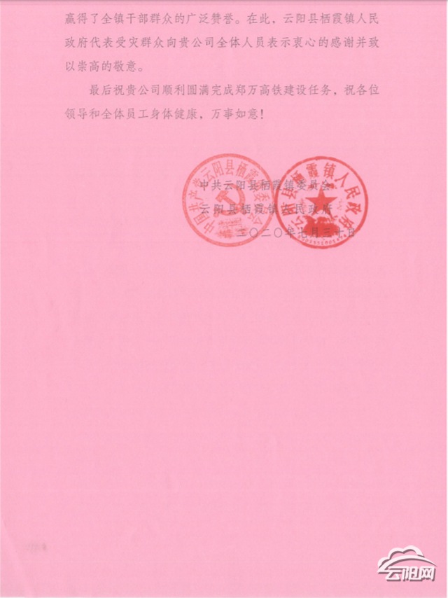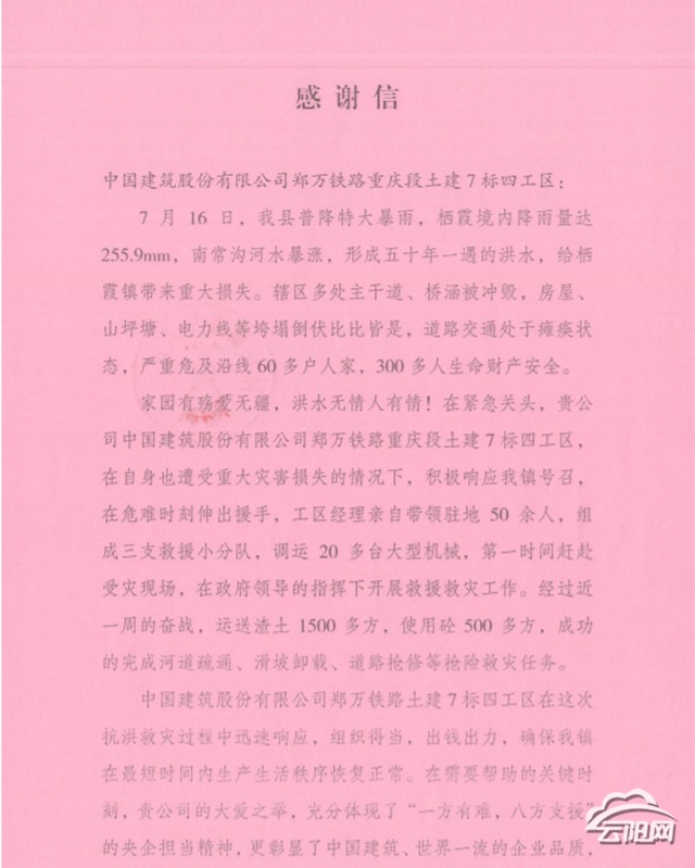 云陽(yáng)網(wǎng)訊(通訊員 孔立梅)8月6日,鄭萬(wàn)鐵路重慶段土建七標(biāo)四工區(qū)收到來(lái)自棲霞鎮(zhèn)贈(zèng)送的錦旗。棲霞鎮(zhèn)此舉是為感謝四工區(qū)在上月對(duì)棲霞鎮(zhèn)抗洪搶險(xiǎn)的莫大幫助。