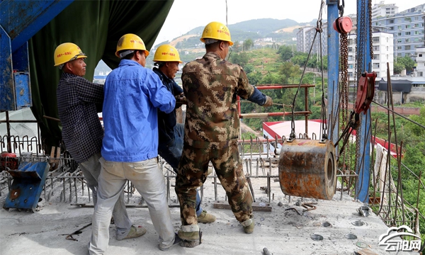 烈日下,來自萬州的鋼筋工程師傅正和工友們進行鋼筋拉張作業(yè),運送設(shè)備,連接高壓油泵與千斤頂……每做一個動作,每一次移動身體,汗水就像下雨一般紛紛滴落。