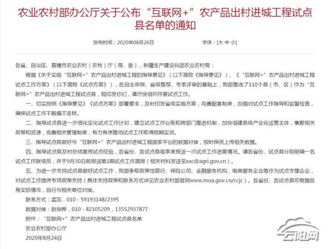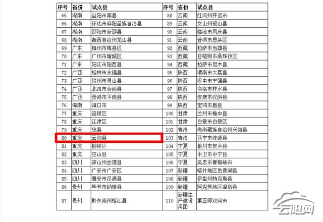云陽(yáng)網(wǎng)訊(實(shí)習(xí)生 李歆宇)近日,農(nóng)業(yè)農(nóng)村部公布110個(gè)“互聯(lián)網(wǎng)+”農(nóng)產(chǎn)品出村進(jìn)城工程試點(diǎn)縣名單。其中,重慶市6個(gè),云陽(yáng)榜上有名。