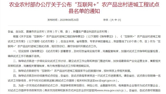 今年,經(jīng)國(guó)務(wù)院同意,農(nóng)業(yè)農(nóng)村部會(huì)同國(guó)家發(fā)展改革委、財(cái)政部、商務(wù)部印發(fā)了《關(guān)于實(shí)施“互聯(lián)網(wǎng)+”農(nóng)產(chǎn)品出村進(jìn)城工程的指導(dǎo)意見(jiàn)》。意見(jiàn)提出,要優(yōu)先選擇包括貧困地區(qū)、特色農(nóng)產(chǎn)品優(yōu)勢(shì)區(qū)在內(nèi)的100個(gè)縣開(kāi)展試點(diǎn),到2021年底,基本完成試點(diǎn)建設(shè)任務(wù)。通過(guò)試點(diǎn),探索形成一批符合各地實(shí)際、可復(fù)制可推廣的推進(jìn)模式和標(biāo)準(zhǔn)規(guī)范,向全國(guó)推廣應(yīng)用。