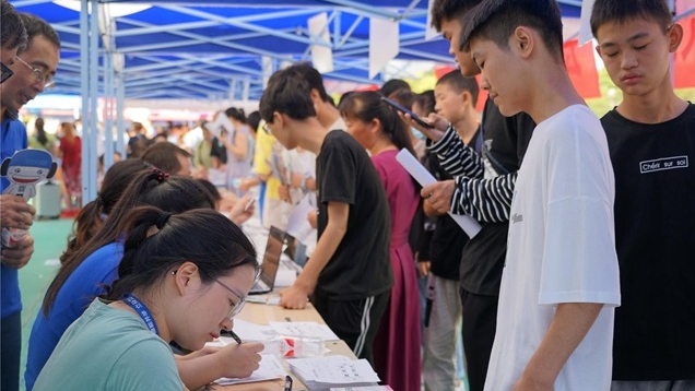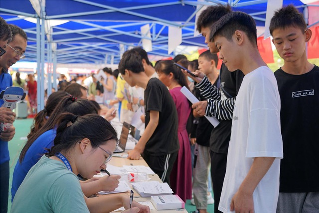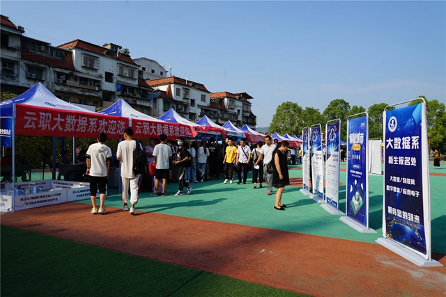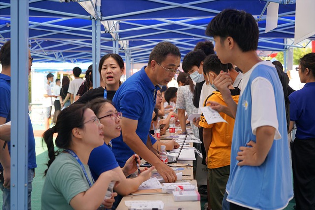 早上8點30左右,在縣職教中心校園內處處可以拎著行李、帶著父母前來報名的心聲。在學校的工業(yè)機器人和大數(shù)據(jù)專業(yè)咨詢報名處,家長學生更是將報名臺圍得水泄不通。