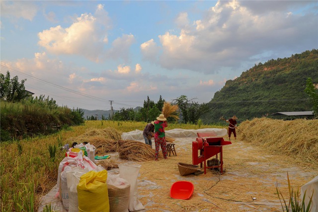 8月31日,盤龍街道石樓村村民用絞稻機(jī)“打谷子”,田間一派忙碌的景象。