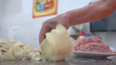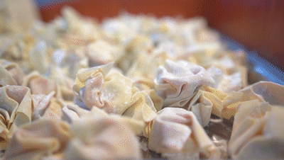 一疊方寸面皮,一盤精致肉餡,借一根筷子助力,一個個包面便在手里快速成型。抓取二兩新鮮包面,放入熬好的高湯之中。