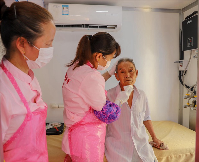 據(jù)介紹,助浴快車類似房車造型,車內(nèi)溫度達到30℃,10余個平方米的空間內(nèi)配備了專業(yè)的洗浴設(shè)備、保健按摩設(shè)備,分洗浴區(qū)、理發(fā)區(qū)、更衣區(qū)等區(qū)域。“老人第一次來洗澡,我們會先對其血壓等測量,看是否可以入浴。”助浴工作人員告訴記者,在助浴前,會對老人的身體進行專業(yè)評估,安排專業(yè)人員進行醫(yī)療護理,條件符合才準入浴。泥溪鎮(zhèn)敬老院院長黃仁清說:“我們這里的護工比較少,很多老人因其行動不便很不容易洗一次澡。此次助浴快車開進我們敬老院,他們的設(shè)備很先進,對老人的服務(wù)也很到位,感謝黨和政府為我們帶來了這樣的福利?!?/p>